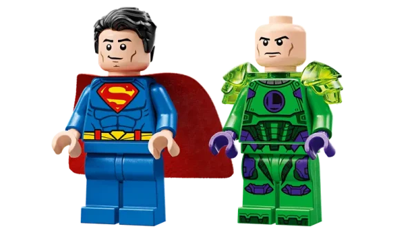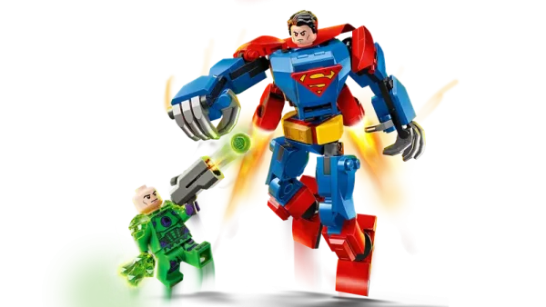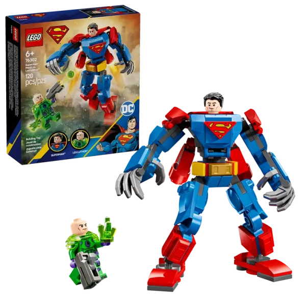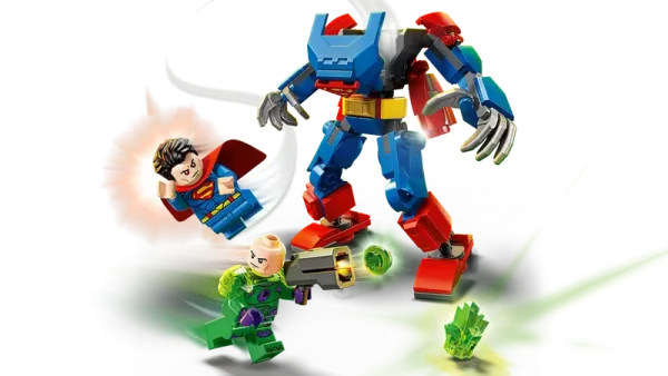 This set includes a buildable Superman mech along with Superman and Lex Luthor minifigures. The mech features movable parts and accessories designed for play or display.