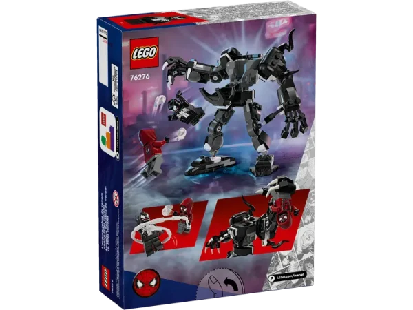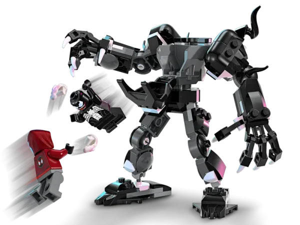 This set includes a buildable Venom mech along with Venom and Miles Morales minifigures. The mech features movable parts and accessories designed for play or display.